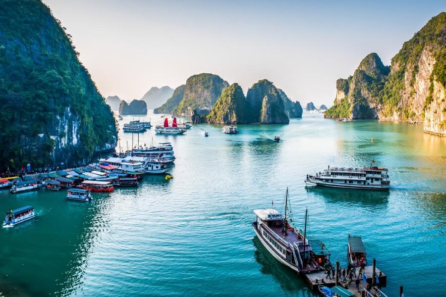 Halong Bay: Embark on an unforgettable overnight cruise aboard a traditional junk boat. Marvel at the thousands of limestone karsts rising majestically from the emerald waters. Explore stunning caves like Sung Sot Cave and enjoy activities such as kayaking or swimming.