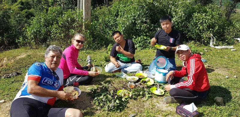 Early breakfast and transfer to Tay Trang border . We say goodbye to Vietnam and hello to Laos. We start the day with a 20-km transfer to a quiet border crossing where it takes between 1-2 hrs to complete immigration formalities. We swap crews, pick up new hire bikes, and begin the journey to the riverside town of Muang Khoua. The ride is beautiful as we descend at first on a recently built but very quiet road, cycling through remote villages mainly comprised of Red or Black Thai ethnic tribes. After lunch, there is a short climb for 10 km, before dropping down to Tat Muang Khoua (390 m) a small sleepy market town built on a steep hillside at the confluence of two rivers, offering plenty of great views.