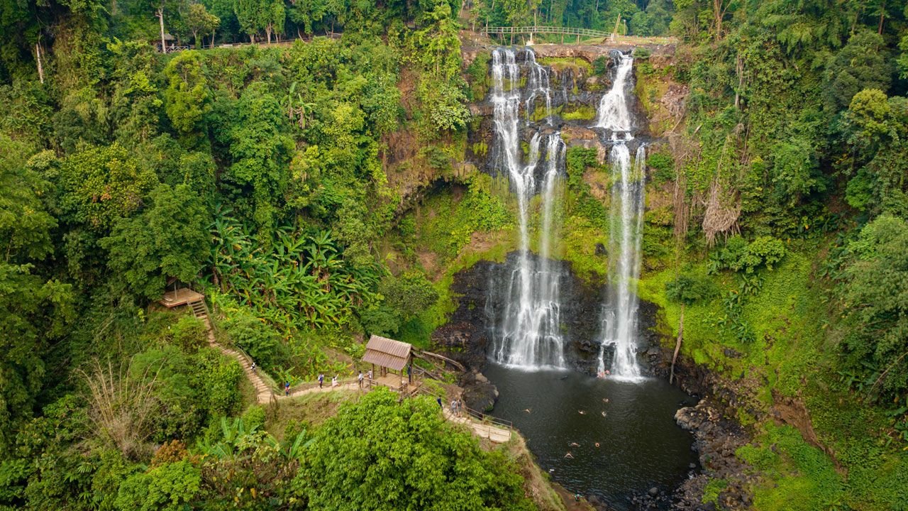 An easy start to the day, after breakfast we ride from the hotel after 8 km on flat road in town the road is slightly up hill to begin our journey into coffee growing area of Laos, the Bolaven plateau. After town we start to climb up into the temperate coffee growing area renowned for its Arabica and Robusta beans. These beans fetch some of the highest coffee prices in the world. The road undulates but has a definite upward feeling. As we climb, we see coffee everywhere as the plantations converge on the side of the road. We finish at the wonderful Tad Fane resort, which provides a stunning backdrop and the very impressive Tad Fane fall, if you are feeling energetic you can cycle to the other waterfall for swimming. Alternatively, you can relax in the restaurant and take the wonderful view. Dinner is at the resort