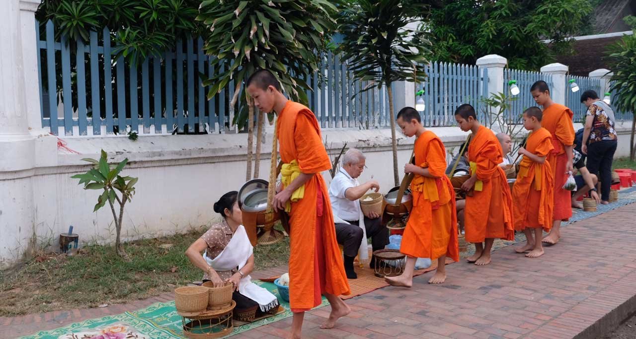Morning Alms Giving Ceremony: Witness the daily spiritual ritual of saffron-robed monks collecting alms at dawn in Luang Prabang.