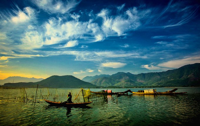 Unique Waterway Landscapes: Explore the vast, serene expanse of Tam Giang Lagoon, Vietnam's largest saltwater lagoon. Capture its unique ecosystem, including fishing farms, floating houses, and intricate waterways, providing distinct landscape compositions.