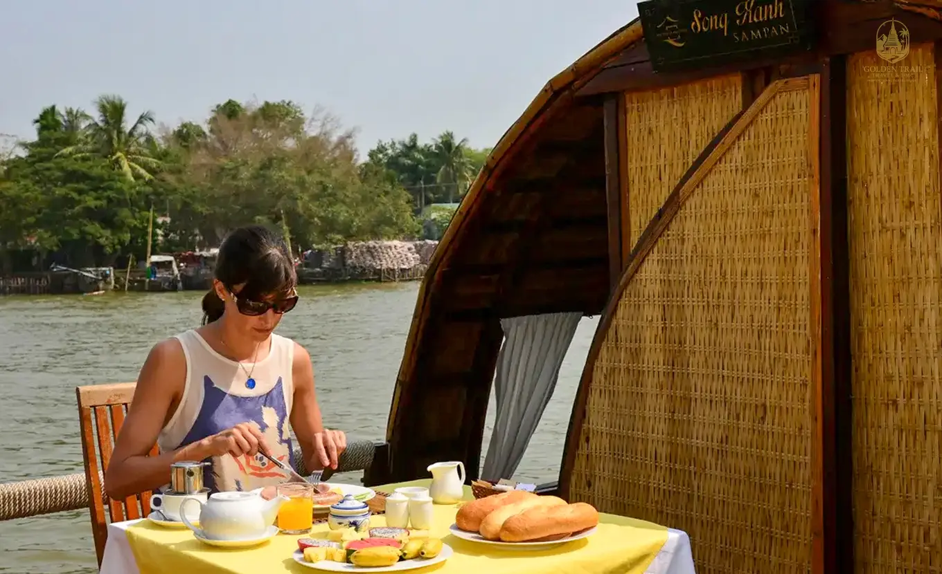Experience: Today marks the pinnacle of your luxury journey: the transfer to Cai Be to embark on the private Song Xanh Sampan for an overnight river cruise. Leaving the city pulse behind, you transition to the tranquil, green world of the Mekong Delta. Upon boarding, you are treated to exclusive service as you glide along the river, observing the vibrant life along the riverbanks.