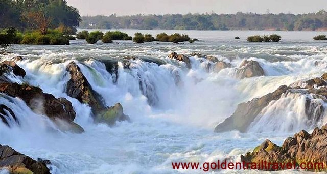 Mighty Khone Phapheng Falls: Marvel at the raw power of Khone Phapheng Falls, Southeast Asia's largest waterfall by volume, an impressive natural spectacle.
