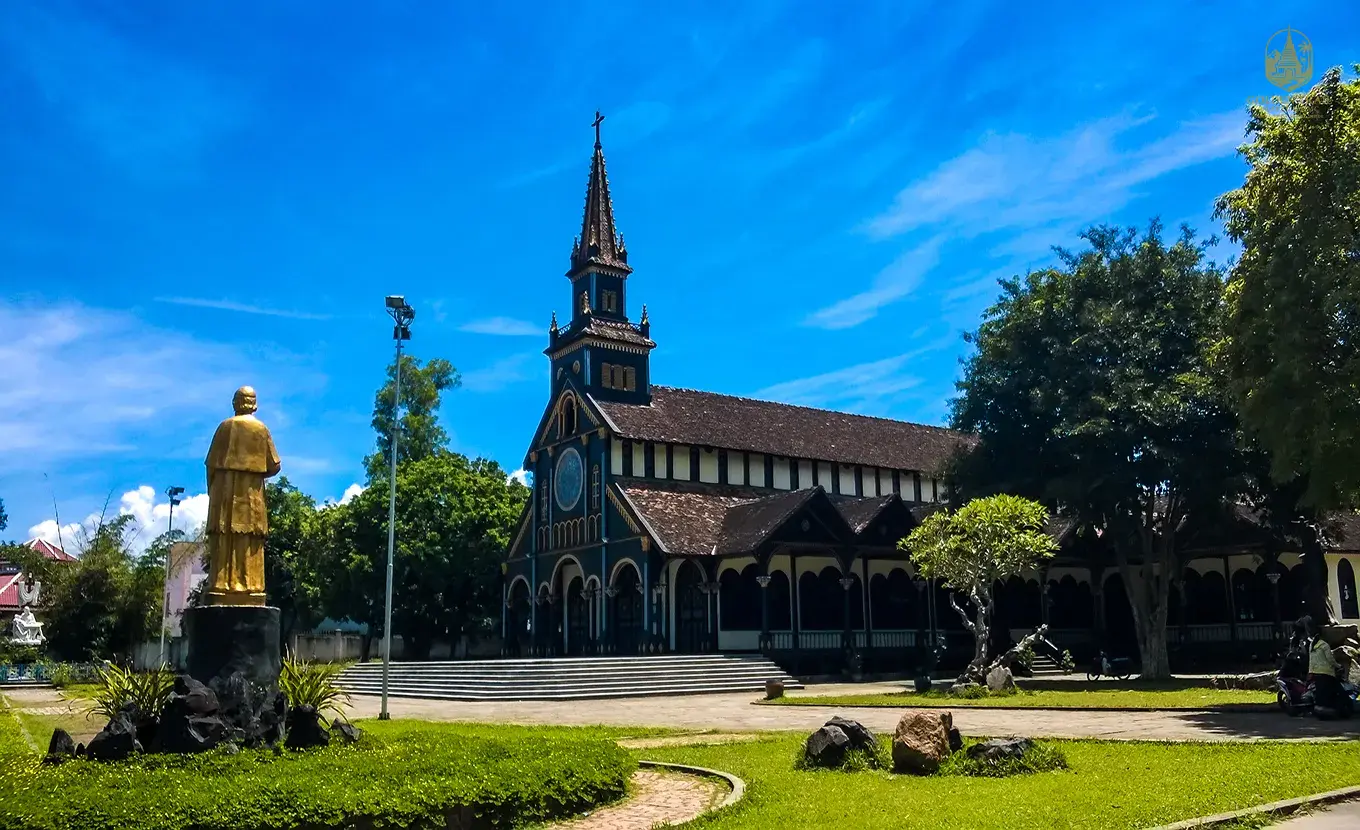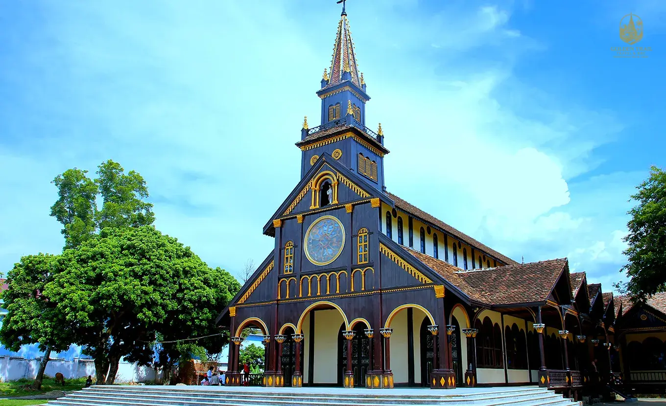 Next, step inside the historic Wooden Church of Kon Tum, built between 1913–1918, where French Gothic design harmonizes with local craftsmanship — stained glass, wooden beams, and native motifs create a warm and spiritual atmosphere.