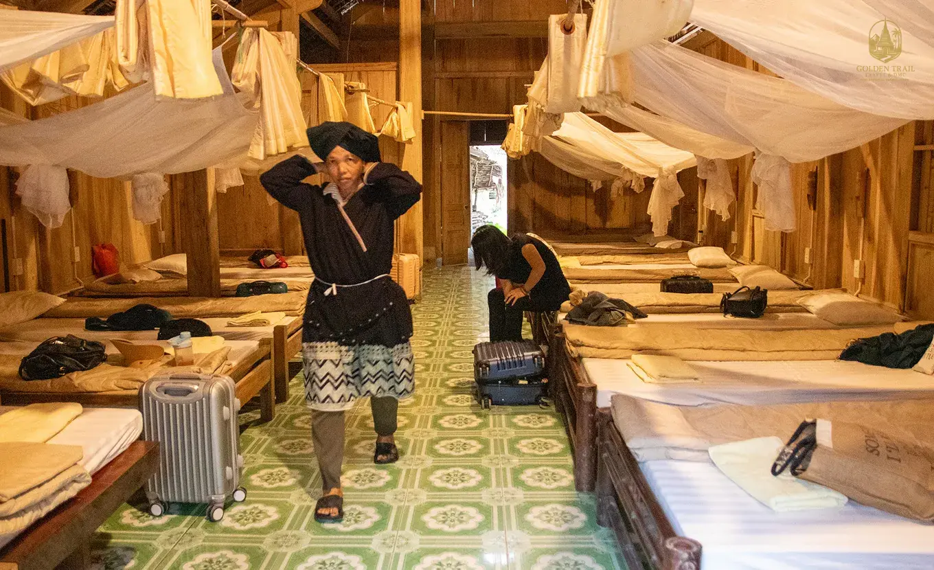 After about four hours, you’ll arrive at Sung Village, home to the Dao Tien ethnic group — a small community of about 400 people who live harmoniously with nature. Their stilt houses, surrounded by lush hills and plantations, create a picture of serenity.