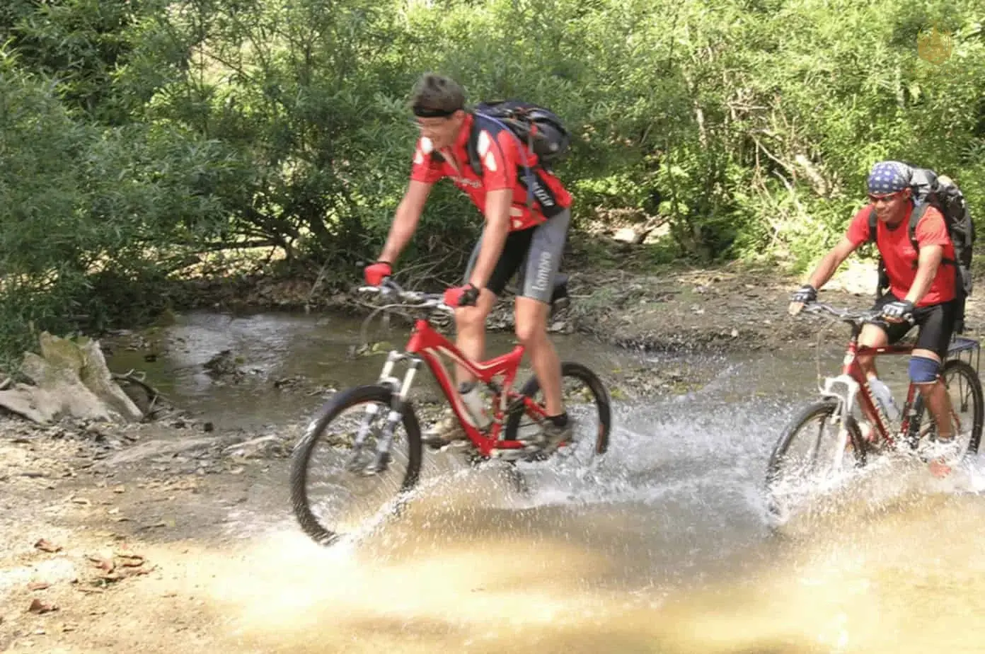 Afternoon: The terrain becomes a playful mix of paved roads and hard-packed dirt trails. We navigate rolling hills, crossing wooden suspension bridges that sway gently over rushing rivers.