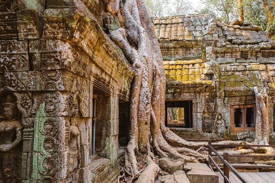 Ta Prohm: Marvel at the "Tomb Raider" temple, where ancient tree roots intertwine with stone ruins, creating a mystical atmosphere.