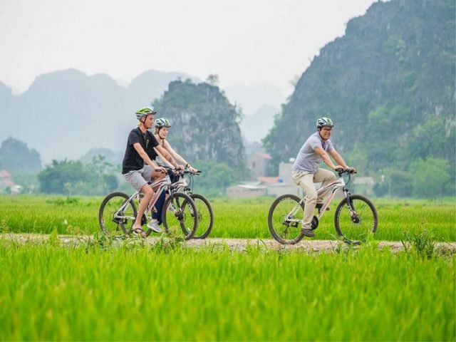 Ninh Binh's "Halong Bay on Land" Exploration: Cycle through the stunning landscapes of Ninh Binh, exploring the serene wetlands of Van Long, the historical significance of Hoa Lu Ancient Capital, and the mesmerizing karst formations of Trang An.