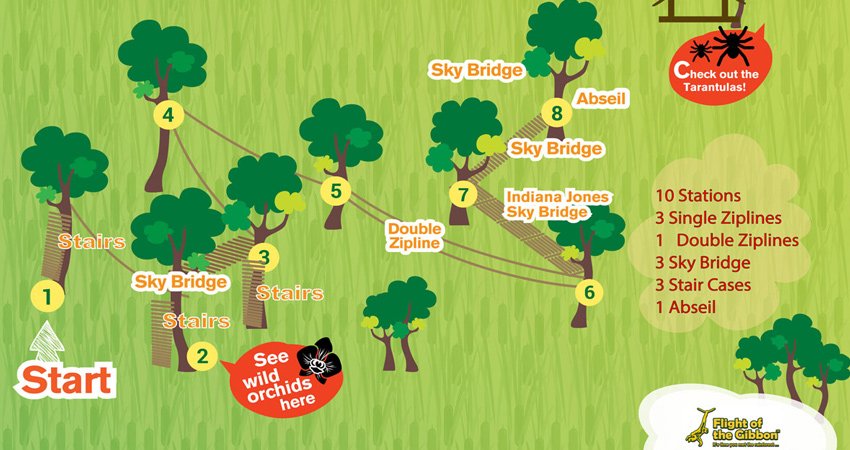 The core of the experience is a series of exhilarating ziplines (flying foxes) that send you soaring through the rainforest canopy. The course typically features multiple long, high lines, allowing you to glide effortlessly above the trees, offering unique aerial views of the jungle and the sounds of its vibrant wildlife. Beyond the ziplines, the adventure often incorporates other exciting elements such as thrilling abseils (rappelling descents) from towering trees, adventurous suspension bridges connecting platforms high in the canopy, and spiraling spiral staircases that add to the vertical dimension of your journey. Each element is designed to provide a new perspective and an additional thrill, carefully integrated into the natural environment.