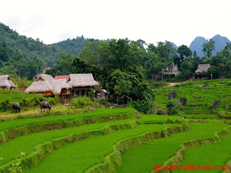 After having breakfast with our new Thai friends, we will be walking for a approximately 5 to 6 hours. The first section is hard with some steep climbs and stream crossings. The second stage is glorious with beautiful views of the valley, rice terraces, rich rain forests, and meandering streams. Your picnic lunch will be provided on the way at Eo Ken village. Arrival in Kho Muong village is always special as the setting of the village is perhaps the most beautiful in Vietnam, nestled between steep karst mountains with rice terraces in the afternoon sun. Spend our second night nearby in a typical Thai eco – stilt home in Kho Muong village.