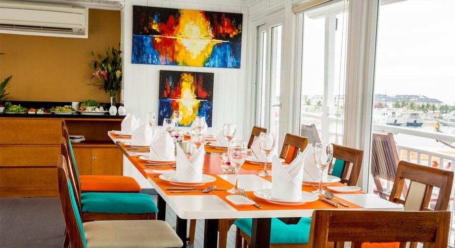 Gourmet Dining Experiences Onboard: Savor an exquisite culinary journey with gourmet meals prepared by onboard master chefs. Enjoy a delectable selection of fresh local seafood and a fusion of Vietnamese and international cuisine, served in elegant dining settings with stunning bay views.