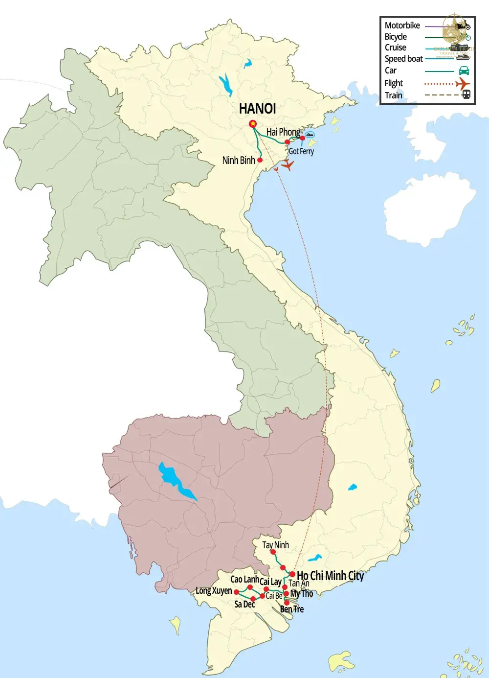 Answer: Golden Trail Travel specializes in offering a wide range of travel packages to Vietnam and other Indochina countries such as Cambodia, Laos, Thailand, Myanmar, Philippines, Singapore, Indonesia, China, and Malaysia. We offer themed tours including Classic Highlights, Cycling, Trekking, Beach Holidays, Luxury Honeymoon, Short Trips, Family, Off The Beaten Track, Multi-Country, Motorbiking, Veteran, Food, Students, Luxury, Golf, Photography, Cooking Class, Bird Watching, Indochina Cruises, Kayaking, Muslim-friendly tours, Offroad 4x4WD, Indochina MICE Travel, Cave Expedition, and Helicopter tours.