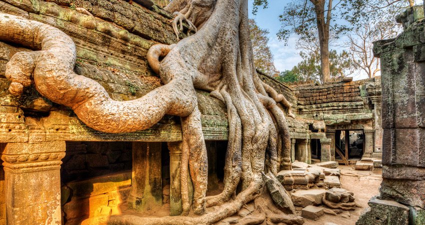 Nature's Embrace at Ta Prohm: Explore the captivating Ta Prohm Temple, where giant tree roots dramatically intertwine with ancient stone ruins, offering stunning photographic opportunities and a unique sense of discovery.