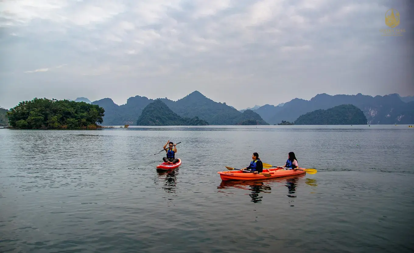The reward? We arrive at the local boat pier and hop onto a boat destined for Da Bia. Here, you transition from mountain conqueror to water adventurer. We launch our kayaking adventure onto Da Bia Lake (part of the vast Da Reservoir), often described as the “Halong Bay of the mountains.” Paddle across the shimmering expanse, flanked by towering limestone karsts, gaining a unique perspective on the remote beauty and the lives of local fishermen. This day is a powerful blend of physical achievement and peaceful reflection.