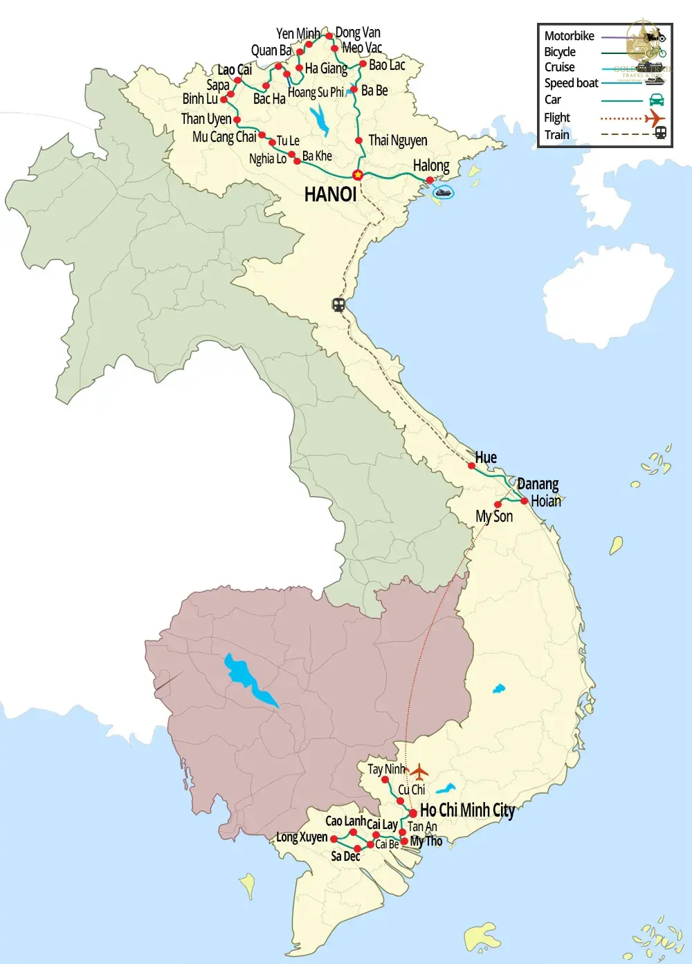 Answer: Golden Trail Travel specializes in offering a wide range of travel packages to Vietnam and other Indochina countries such as Cambodia, Laos, Thailand, Myanmar, Philippines, Singapore, Indonesia, China, and Malaysia. We offer themed tours including Classic Highlights, Cycling, Trekking, Beach Holidays, Luxury Honeymoon, Short Trips, Family, Off The Beaten Track, Multi-Country, Motorbiking, Veteran, Food, Students, Luxury, Golf, Photography, Cooking Class, Bird Watching, Indochina Cruises, Kayaking, Muslim-friendly tours, Offroad 4x4WD, Indochina MICE Travel, Cave Expedition, and Helicopter tours.