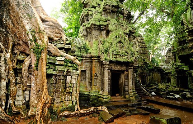 Nature's Embrace at Ta Prohm: Experience the ethereal beauty of Ta Prohm Temple, famously known as the "Tomb Raider temple," where giant tree roots dramatically intertwine with ancient stone ruins, creating a stunning fusion of nature and architecture.