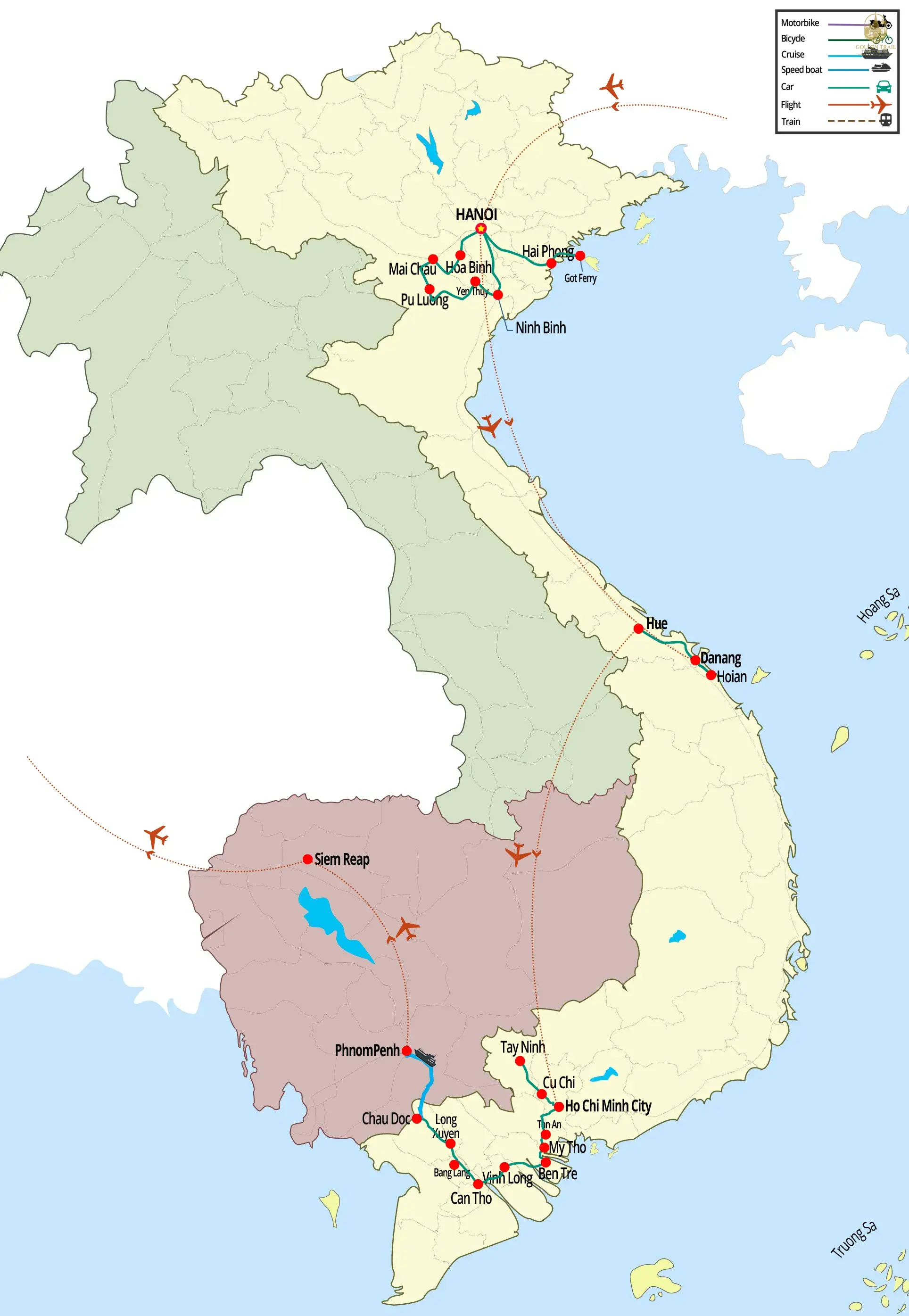 Answer: Golden Trail Travel specializes in offering a wide range of travel packages to Vietnam and other Indochina countries such as Cambodia, Laos, Thailand, Myanmar, Philippines, Singapore, Indonesia, China, and Malaysia. We offer themed tours including Classic Highlights, Cycling, Trekking, Beach Holidays, Luxury Honeymoon, Short Trips, Family, Off The Beaten Track, Multi-Country, Motorbiking, Veteran, Food, Students, Luxury, Golf, Photography, Cooking Class, Bird Watching, Indochina Cruises, Kayaking, Muslim-friendly tours, Offroad 4x4WD, Indochina MICE Travel, Cave Expedition, and Helicopter tours.