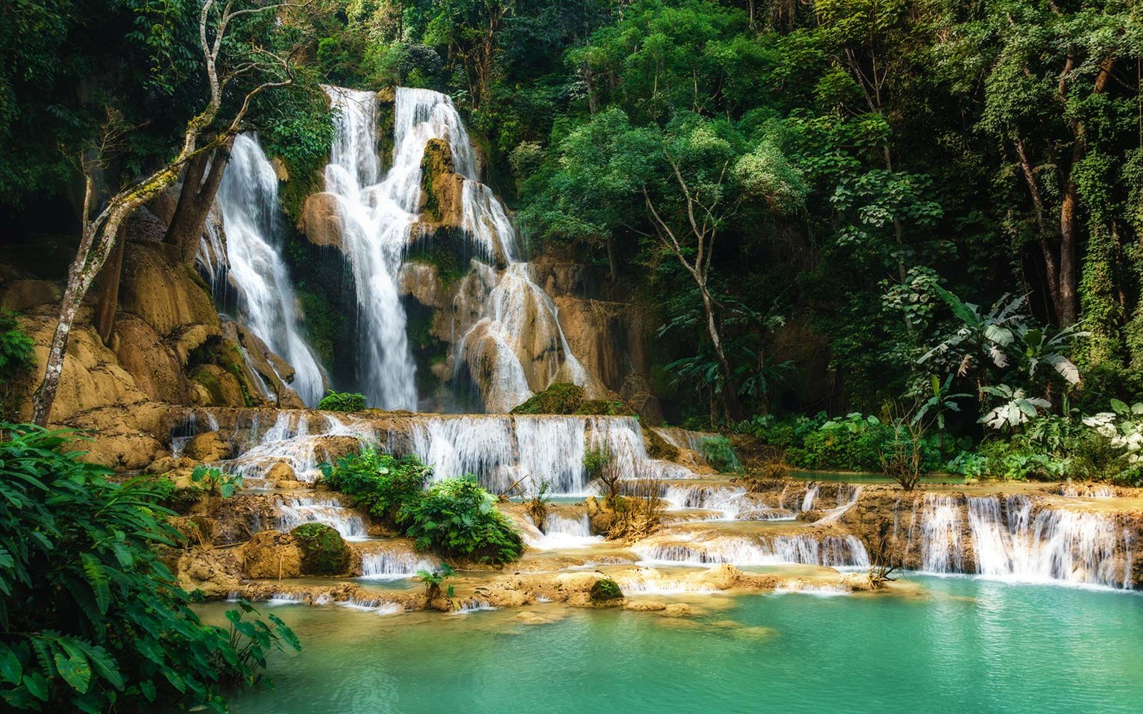 Kuang Si Waterfall Excursion: Discover the stunning multi-tiered turquoise pools of Kuang Si Waterfall, perfect for swimming and relaxation amidst lush jungle.
