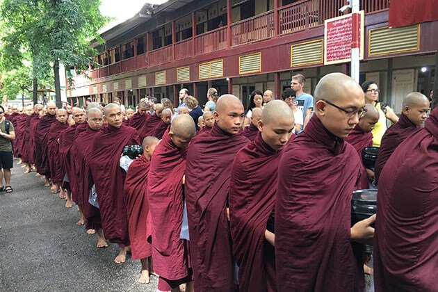 Breakfast at the hotel. Check–out at the hotel and transfer to the airport. Depart for Mandalay by a morning domestic flight, schedules flight ) ( 30 mins flying). Arrive at Mandalay International Airport. First, excursion to Amarapura: Maha Gandayone Monastery – home to several thousand young monks where you can watch the whole monastery having their meal silently, 200 years old U Bein teak bridge built in 1728 at the time when Amarapura was Royal capital. Visit traditional hand-woven silk workshop teak posts.