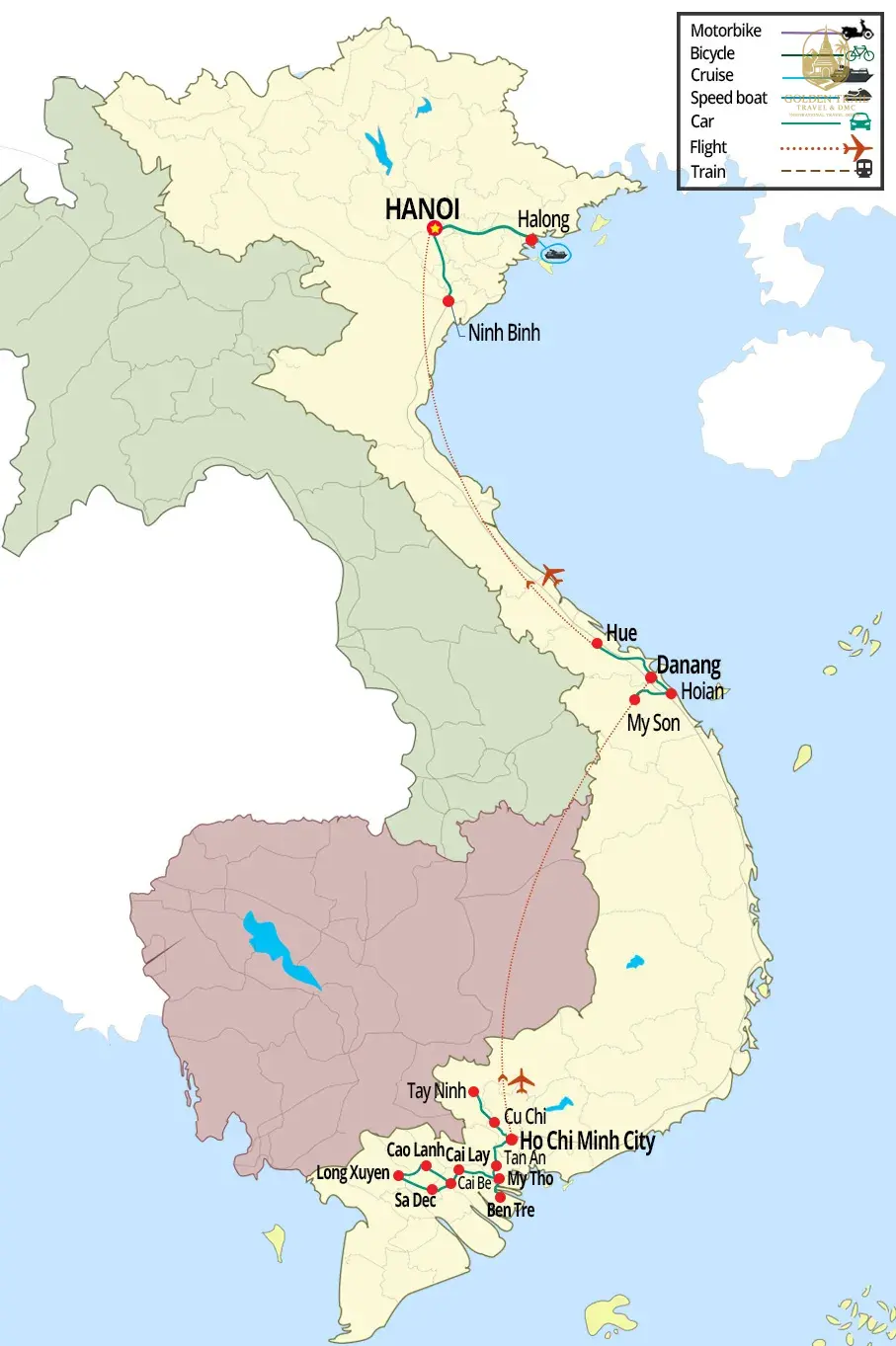 Answer: Golden Trail Travel specializes in offering a wide range of travel packages to Vietnam and other Indochina countries such as Cambodia, Laos, Thailand, Myanmar, Philippines, Singapore, Indonesia, China, and Malaysia. We offer themed tours including Classic Highlights, Cycling, Trekking, Beach Holidays, Luxury Honeymoon, Short Trips, Family, Off The Beaten Track, Multi-Country, Motorbiking, Veteran, Food, Students, Luxury, Golf, Photography, Cooking Class, Bird Watching, Indochina Cruises, Kayaking, Muslim-friendly tours, Offroad 4x4WD, Indochina MICE Travel, Cave Expedition, and Helicopter tours.