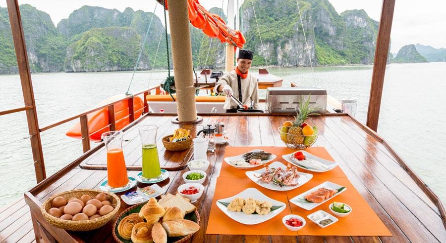 Gourmet Dining Experiences Onboard: Savor an exquisite culinary journey with gourmet meals prepared by onboard master chefs. Enjoy a delectable selection of fresh local seafood and a fusion of Vietnamese and international cuisine, served in elegant dining settings with stunning bay views.