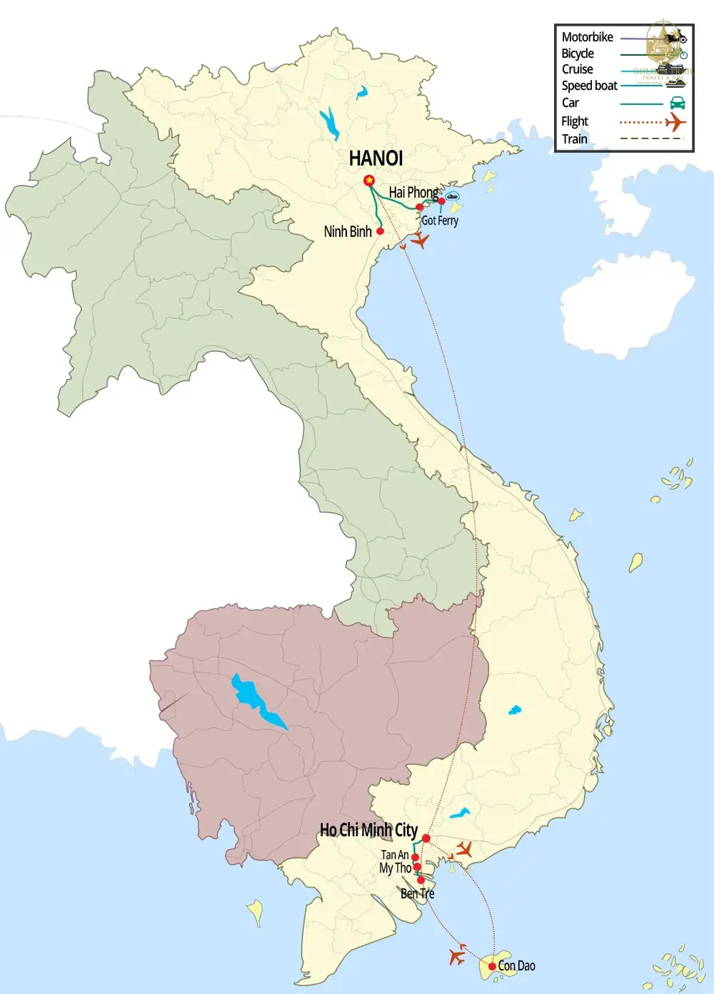 Answer: Golden Trail Travel specializes in offering a wide range of travel packages to Vietnam and other Indochina countries such as Cambodia, Laos, Thailand, Myanmar, Philippines, Singapore, Indonesia, China, and Malaysia. We offer themed tours including Classic Highlights, Cycling, Trekking, Beach Holidays, Luxury Honeymoon, Short Trips, Family, Off The Beaten Track, Multi-Country, Motorbiking, Veteran, Food, Students, Luxury, Golf, Photography, Cooking Class, Bird Watching, Indochina Cruises, Kayaking, Muslim-friendly tours, Offroad 4x4WD, Indochina MICE Travel, Cave Expedition, and Helicopter tours.