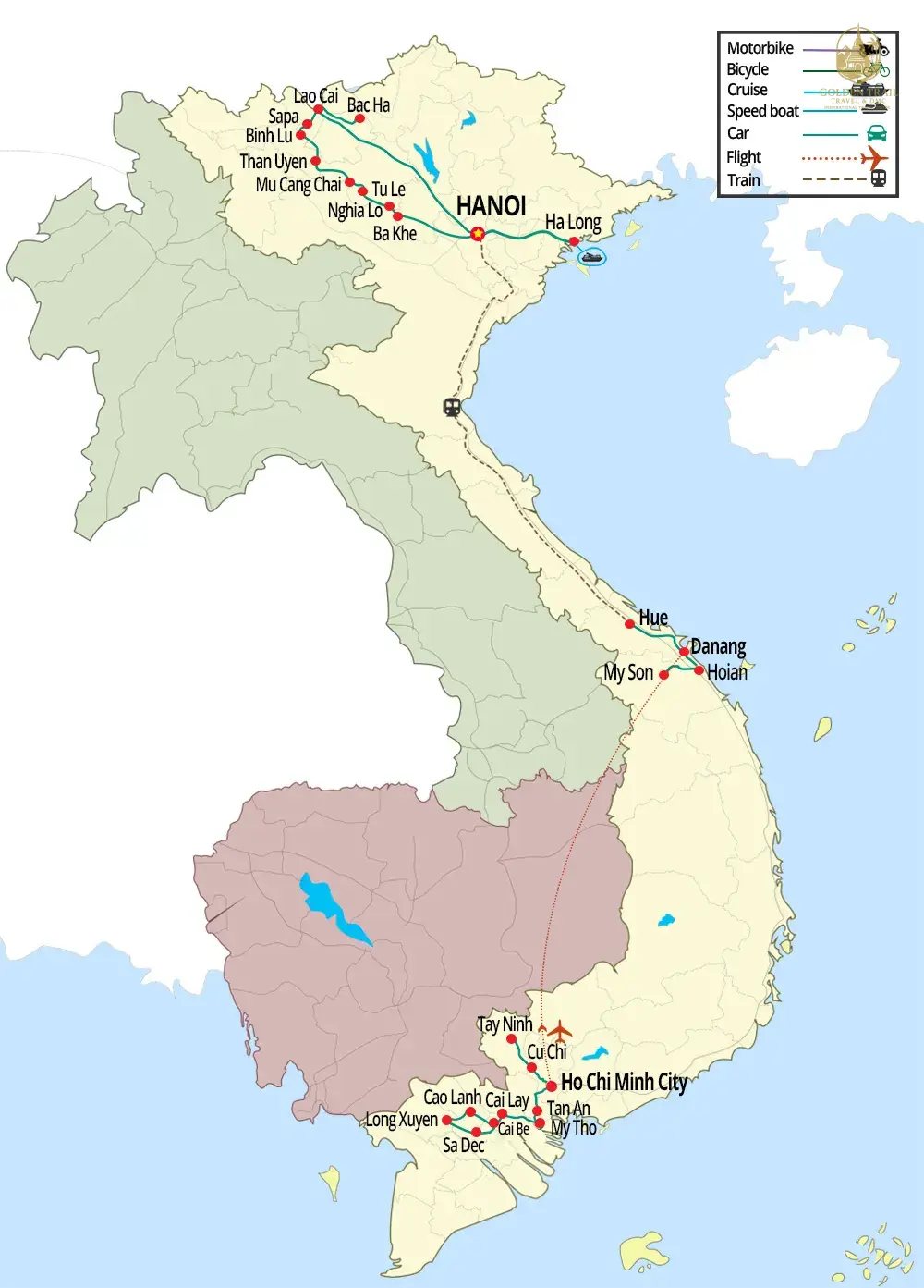 Answer: Golden Trail Travel specializes in offering a wide range of travel packages to Vietnam and other Indochina countries such as Cambodia, Laos, Thailand, Myanmar, Philippines, Singapore, Indonesia, China, and Malaysia. We offer themed tours including Classic Highlights, Cycling, Trekking, Beach Holidays, Luxury Honeymoon, Short Trips, Family, Off The Beaten Track, Multi-Country, Motorbiking, Veteran, Food, Students, Luxury, Golf, Photography, Cooking Class, Bird Watching, Indochina Cruises, Kayaking, Muslim-friendly tours, Offroad 4x4WD, Indochina MICE Travel, Cave Expedition, and Helicopter tours.