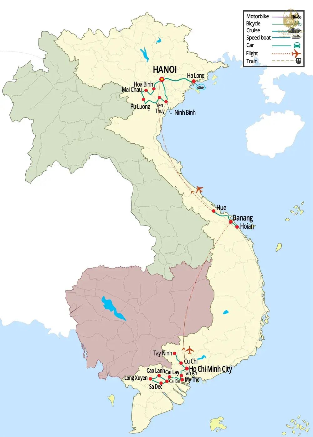 Answer: Golden Trail Travel specializes in offering a wide range of travel packages to Vietnam and other Indochina countries such as Cambodia, Laos, Thailand, Myanmar, Philippines, Singapore, Indonesia, China, and Malaysia. We offer themed tours including Classic Highlights, Cycling, Trekking, Beach Holidays, Luxury Honeymoon, Short Trips, Family, Off The Beaten Track, Multi-Country, Motorbiking, Veteran, Food, Students, Luxury, Golf, Photography, Cooking Class, Bird Watching, Indochina Cruises, Kayaking, Muslim-friendly tours, Offroad 4x4WD, Indochina MICE Travel, Cave Expedition, and Helicopter tours.